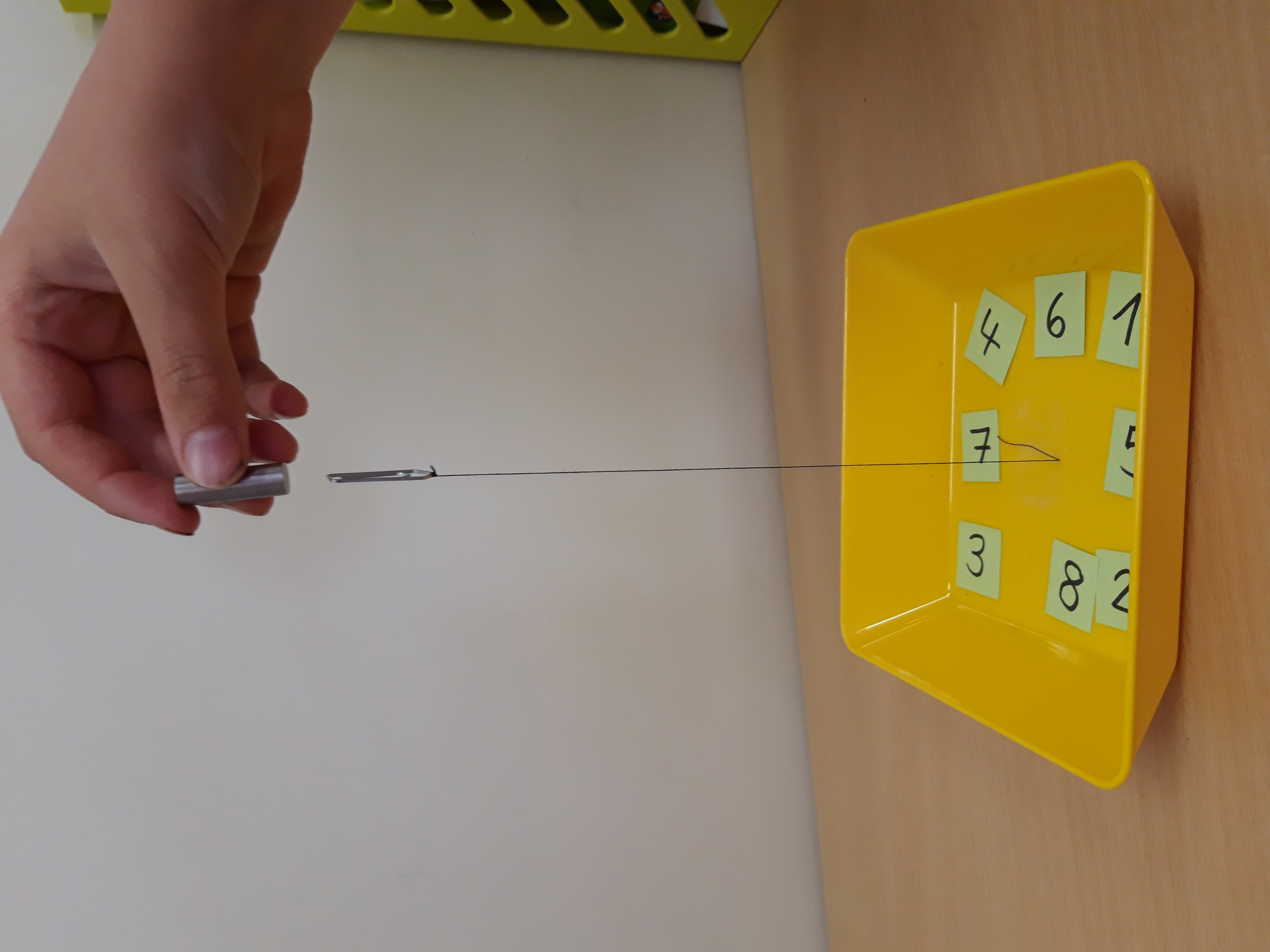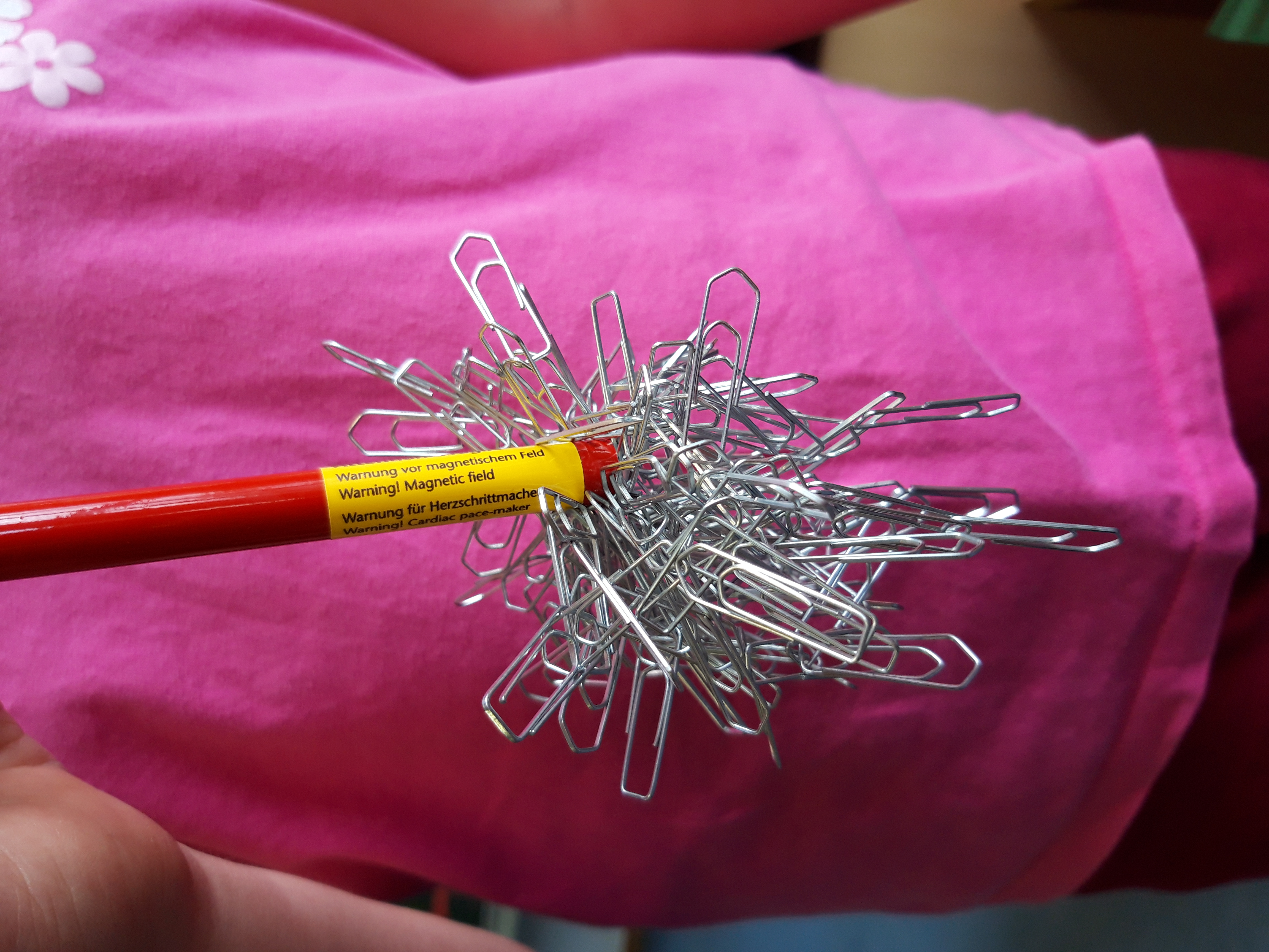Test: Zieht die Stricknadel nun eine Büroklammer an? Wenn ja, dann hats geklappt! Sie ist jetzt für kurze Zeit magnetisch!