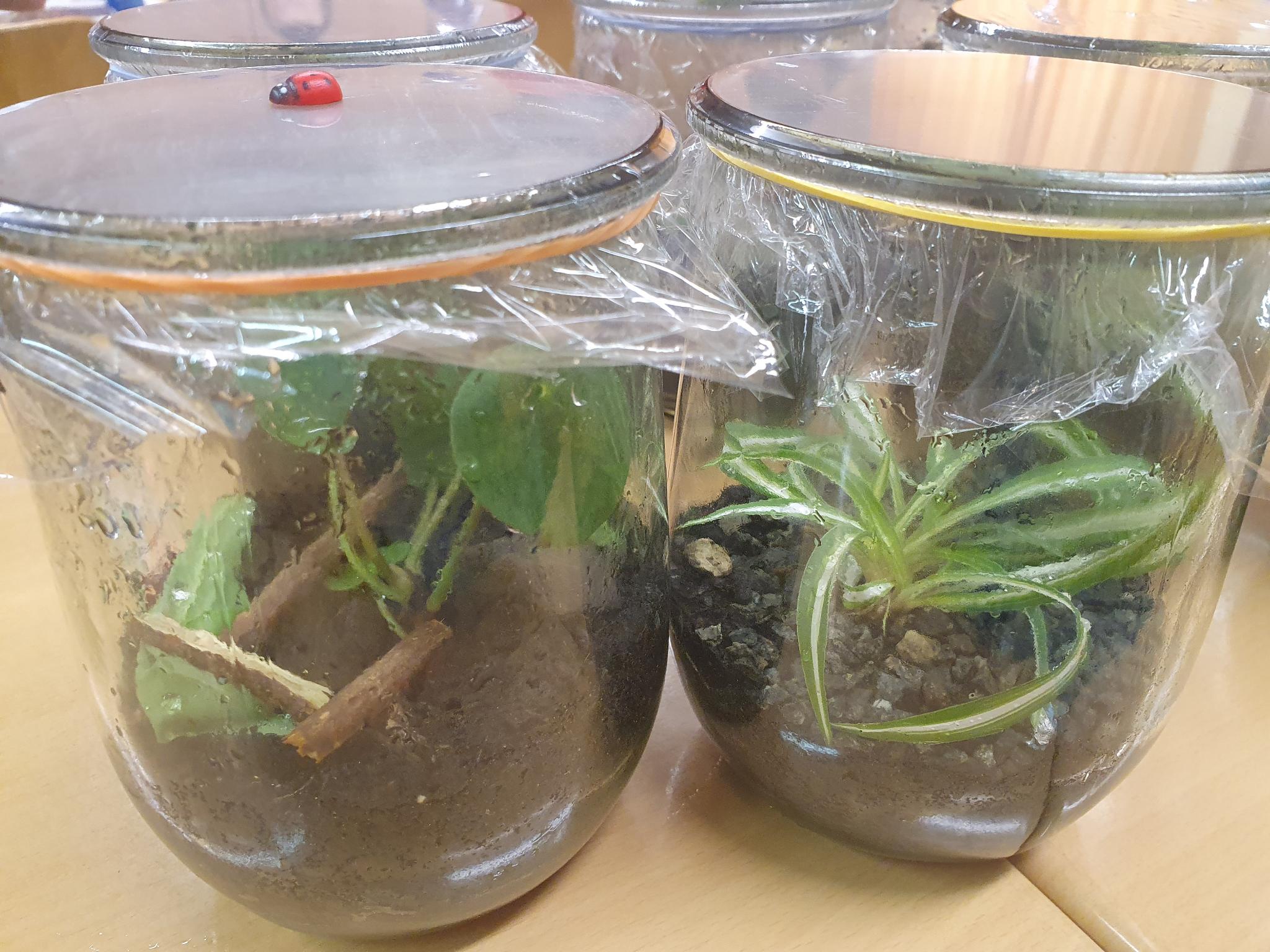 Um den Wasserkreislauf zu verdeutlichen hat jedes Kind seinen eigenen kleinen Wasserkreislauf im Einmachglas gebaut.
